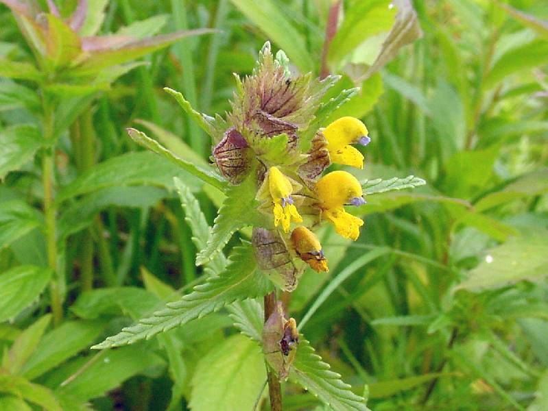 Rhinanthus minor Linnaeus subsp. minor, var. fallax Wimmer & Grabowski - Common Yellowrattle - [NF, LAB] [i] (longer, acute or truncate-acute, bluish galea nipples; dark basal spot on lateral lobes of lower lip; bract teeth bristle-tipped; leaves +/- lanceolate)