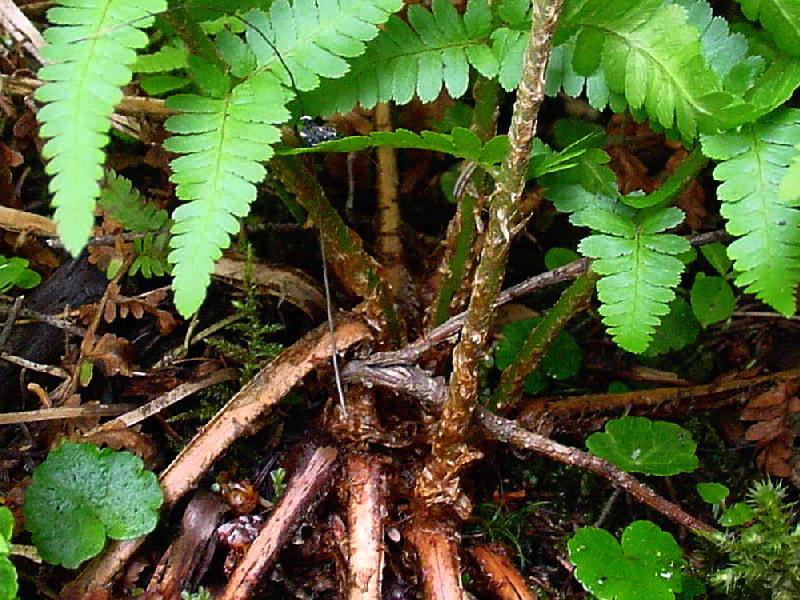 Pouch Cove, Newfoundland. Meetinghouse Road Blueberry Road. High barren ridges. Chasms within bedrock. September 4, 2004. [Digital - John Maunder]Frond Base, Closeup [Note short glandular hairs on central rachis]