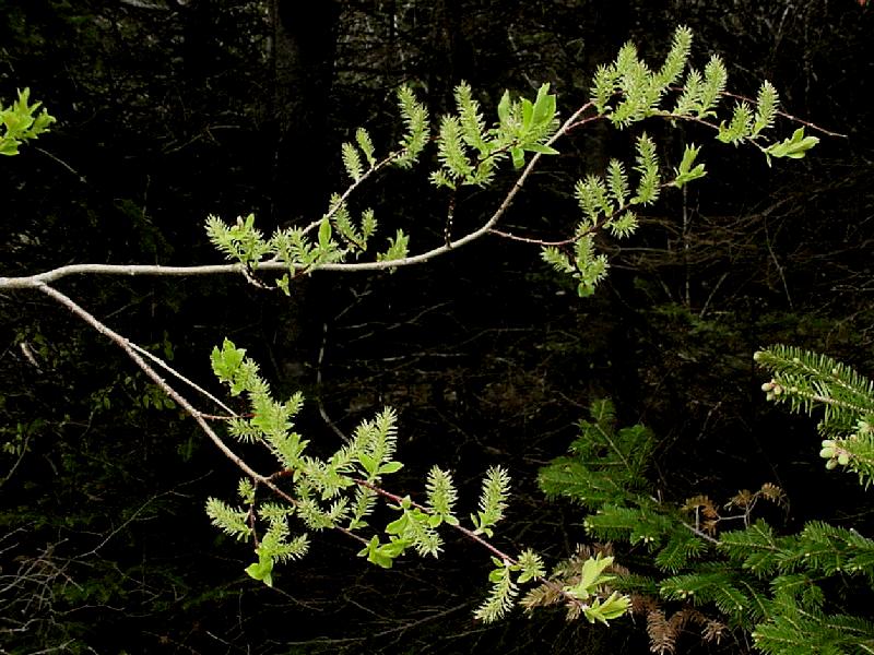 Four Mile Cove, Northern Peninsula, Newfoundland. June 15, 2002. [Transparency - Nathalie Djan-Chékar]Male Catkins and Leaves